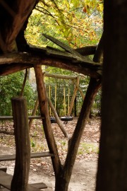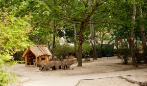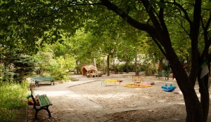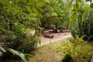 | |  | |  | Spielplatz und Garten | | Blick durchs Holzhaus | | Sandkasten |