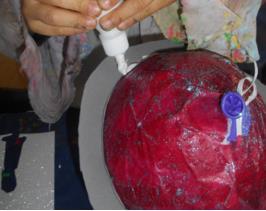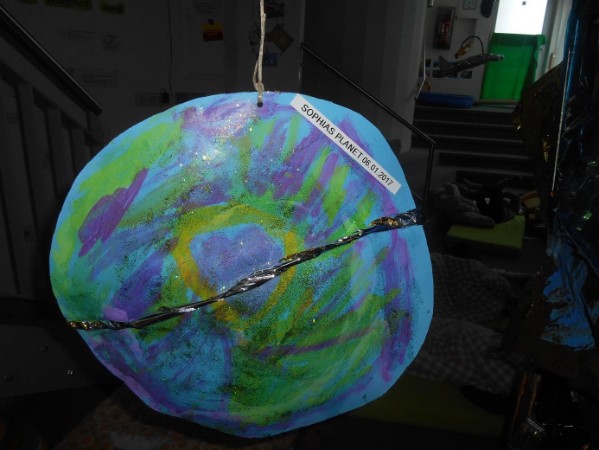 Mit bunter Fingermalfarbe, Wasserfarben und Glitzer entstehen sphärische Muster, die mit einem Silberfolien-Ring um den Pappkreis vervollständigt werden. Da drehen die Kinder von beiden Seiten einen langen Streifen Folie ein und kleben ihn dann umsichtig zusammen. Mit Faden und Schere bewaffnet suchen wir in der Gruppe einen Platz für die neuen Planeten unseres Sonnensystems.