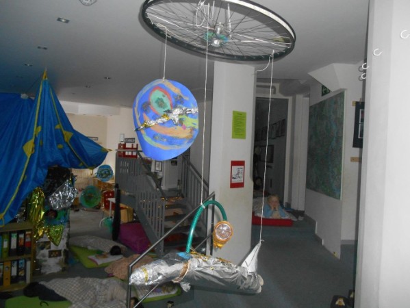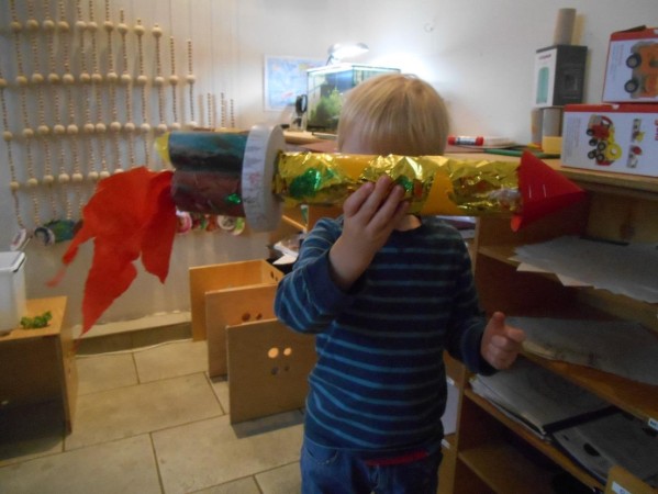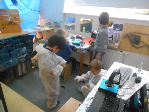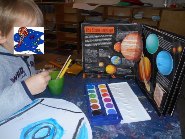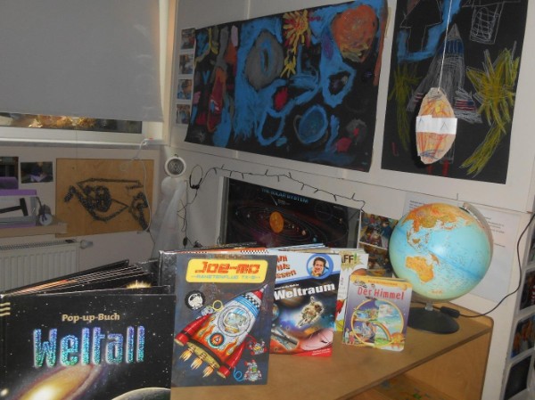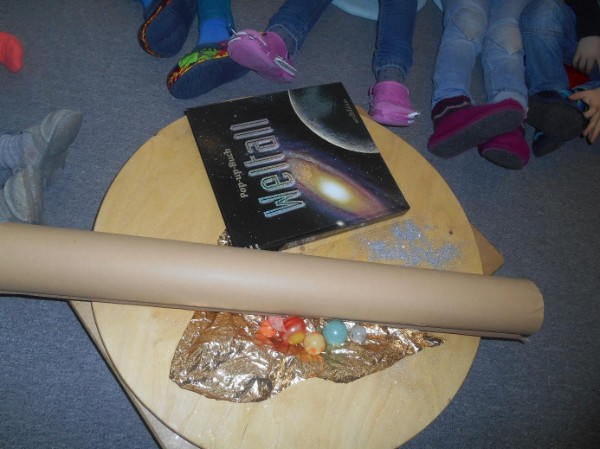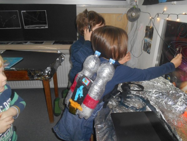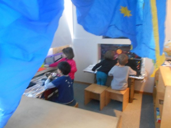 Immer wieder verkündet die Projektgruppe während ihres Rollenspiels in der Weltraumecke, was an ihr noch fehle. Wenn man aus der Rakete mit dem Fernrohr schaue, müsse man doch Ausschau auf die Planeten halten können. Motiviert begeben sich diverse Kinder an die Gestaltung.