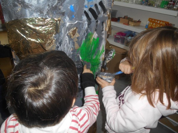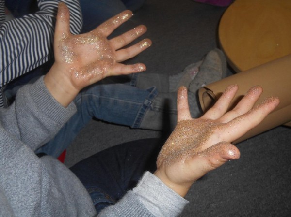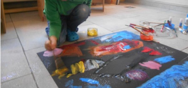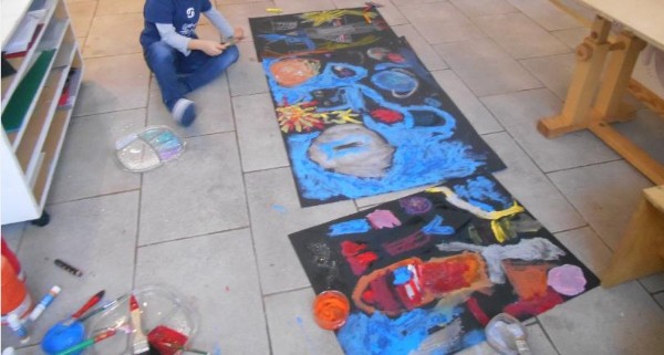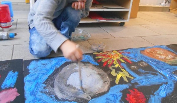 Für den Ausblick aus dem Cockpit in der Weltraumecke werden die Kinder noch einmal kreativ. Mit möglichst großer Fläche für die Gestaltung findet dieses Angebot auf dem Boden des Ateliers statt – auf etwa 6 qm Pappkarton mit Fingerfarben und Glitzer.