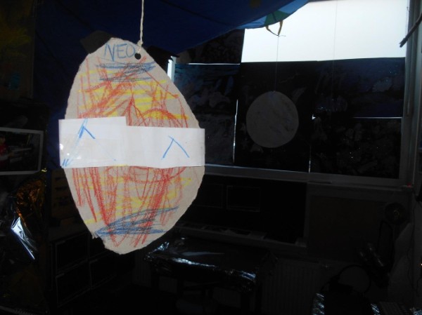 Neo: „Die Räder brauchen eine Düse. Wir brauchen den Karton, sonst können wir nicht anfangen. Wir können ganz viele Planeten machen. Aber nicht den Saturn, den hab ich schon. Ich mach erstmal die Erde jetzt. Die Erde ist blau.“
