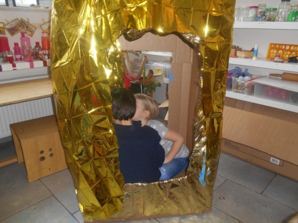 Die Kinder werfen die große Rakete aus Pappkarton mit aller Kraft um und setzten sich von oben rein. Die Rakete ist nun ein U-Boot. Eine neue Reise beginnt.
