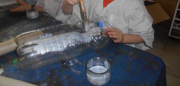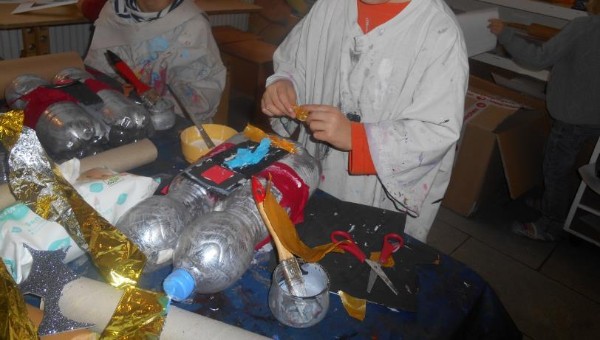 Nachdem die Raumanzüge fertig mit Flaggen versehen ihren Platz in der Weltraumecke finden, bemalen Jakob und Neo jeweils zwei Plastikflaschen mit silberner Farbe und kleben sie zusammen.