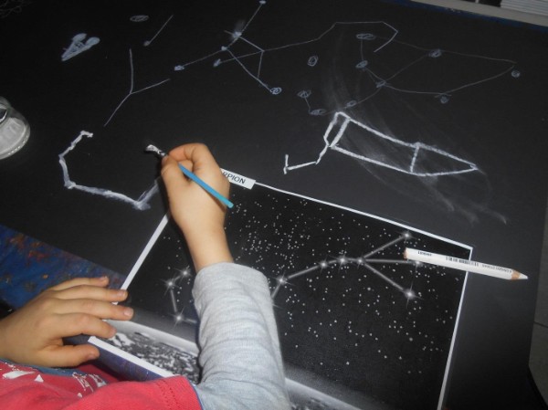 Noch am gleichen Tag entstehen die ersten Werke. Obwohl die Räume selbstverständlich allen Kindern gleichermaßen offenstehen, sind es wieder die Kinder der Projektgruppe, die den Impuls als erstes in ihr Spiel integrieren. Die ersten Sternenbilder entstehen. Tiu und Emmy zeichnen den Löwen umsichtig nach, während Neo direkt den Skorpion als sein Sternzeichen erkennt, ihn ablöst und mit ins Atelier nimmt. Dort holt er sich weiße Fingerfarbe und zeichnet damit den Skorpion ab. Auch Emmy ergänzt ihre Materialien im Atelier durch silbernes Glitzer und Fingerfarben.