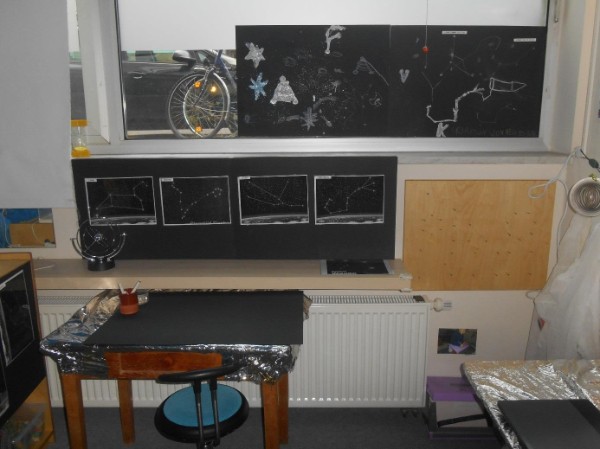 In der Weltraumecke werden DinA4-große laminierte Abbildungen der Sternenbilder mit Kreppband auf große schwarze Pappen geklebt, die sich auf Augenhöhe der Kinder befinden. Durch das Kreppband ist es den Kindern möglich, die Sternenbilder jederzeit abzulösen. Zwischen den Bildern wird den Kindern auf dem mit Silberfolie verkleideten Tisch große schwarze Pappe bereitgelegt, sowie weiße Kreide und weiße Buntstifte. Dieser Impuls bleibt von der Erzieher/in unkommentiert.