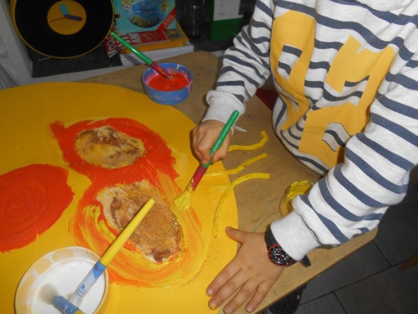 Verschieden große Pappkreise bilden unsere Planeten. Manche Kinder möchten einen real existierenden Planeten aus dem Buch nachgestalten, wie den Saturn oder die Erde. Andere nutzen die Materialien in eigener Regie und kreieren phantasievolle neue Planeten, die allerdings namenlos bleiben.