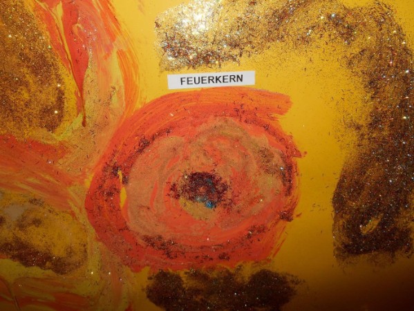 „Das ist der Feuerkern“, ruft Jakob, „weißt du, ich hab eine gute Idee. Lass uns eine Sonne machen. Aber eine ganz große. Die kann dann in die Weltraumecke.“