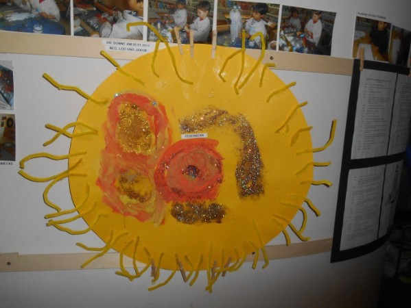 In jedem Bereich der Gruppe ist das Sonnensystem nun präsent. Im Eingangsbereich hängen die Kinder ihre Sonne zunächst aus, um sie ihren Eltern zu zeigen. Wir ergänzen das Werk mit Fotos und Erläuterungen. Zu einem späteren Zeitpunkt findet jeder Himmelskörper seinen Platz im Gruppenraum.