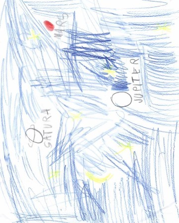 Neo: „Wir malen so Bilder. Jeder malt einen Planeten. Niemand malt den Saturn, weil ich mal den Saturn. Guck, der Saturn ist so graulich braun.“