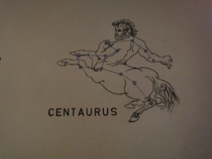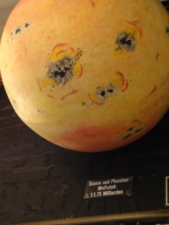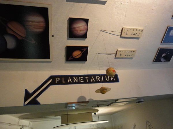 Die Eltern verabschieden sich für eine Stunde und Sternwärter Tim geleitet uns in den ersten Raum. Am Treppengeländer schlängeln sich die einzelnen Sternbilder hinunter, an der Decke hängt eine proportional korrekte Gestaltung des Sonnensystems.