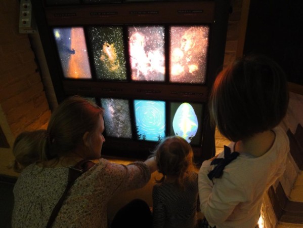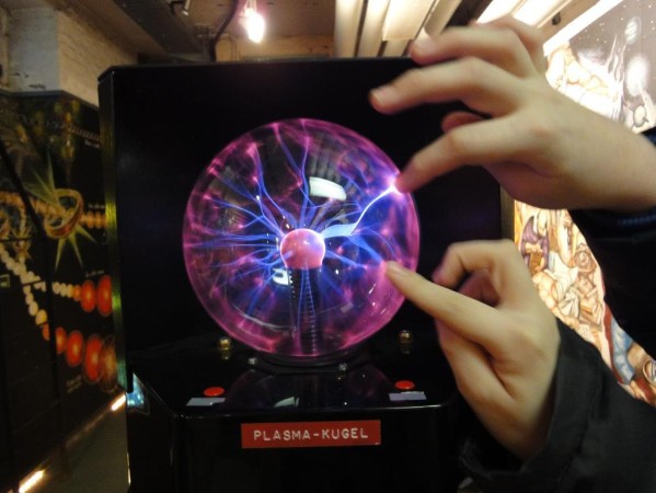 Wir gehen vorbei an leuchtend violetten Abbildungen der Milchstraße (Sophia: „Ich stell mir immer vor, dass das eine Straße ist mit Milch.“ Mats: „Nein, das sind ganz viele Sterne!“), an verstellbaren Teleskopen und einer Glaskugel, die violette Blitze an die Fingerspitzen schickt,