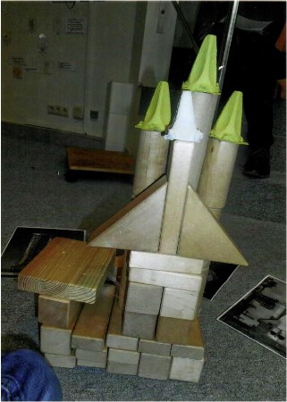 Auch im Konstruktionsbereich der Gruppe wurden Impulse zum Projektthema gesetzt, nachdem die Kinder auch hier Raketen und Raumschiffe in ihr Spiel integriert hatten. Wir legten verschiedene Abbildungen der Raumfahrt am Bauteppich aus, die die Kinder sogleich in ihre Konstruktion mit aufnahmen. Es entstanden durchdachte Raketen und Raumstationen.